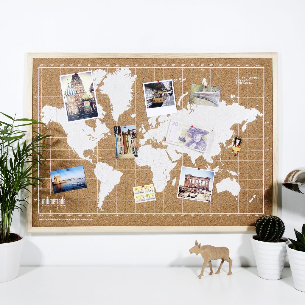 Nuestro nuevo tablero de corcho con un mapamundi impreso en blanco es perfecto para las madres viajeras: además de bonito, decorativo y práctico, está hecho con materiales naturales obtenidos en la península ibérica, y apoyando la producción local eliminamos la contaminación derivada del transporte de mercancías.