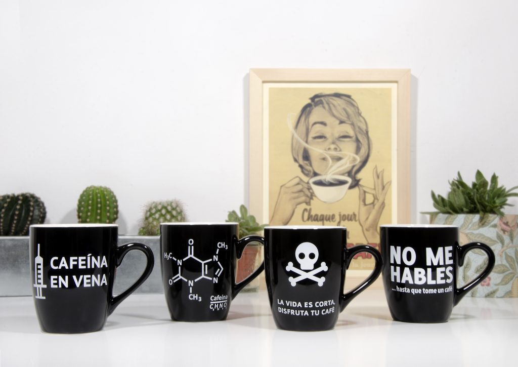 La serie de tazas con mensaje Cafeinómanos está diseñada en exclusiva para los amantes del café. Las tazas para adictos a la cafeína, con mensajes en blanco sobre negro, se han creado para todos aquellos que «podrían medir su vida a cucharadas de café».