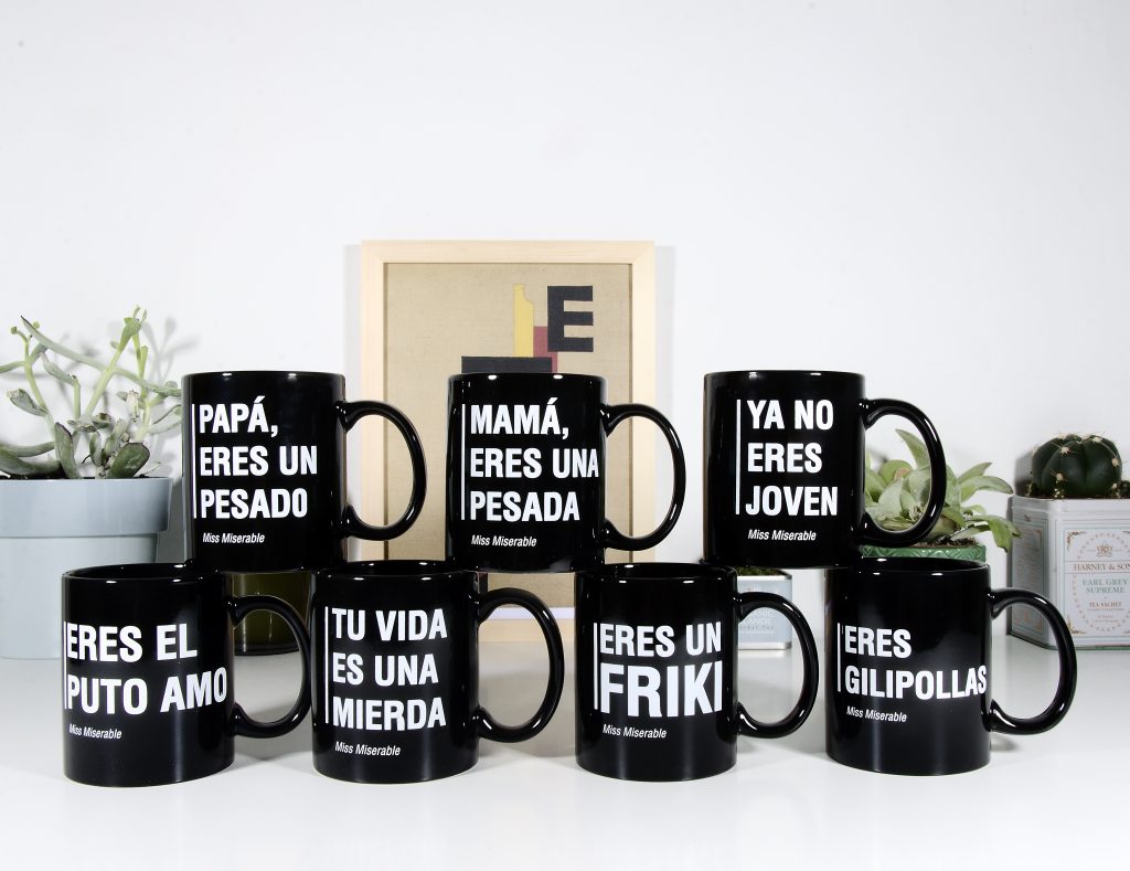 Miss Miserable son tazas, cuadernos, globos… que comunican mensajes radicalmente diferentes, focalizados en asumir los aspectos negativos de la vida con ironía y sentido autocrítico. La taza «Ya no eres joven», el cuaderno «Odio las reuniones» o la bolsa de algodón «Tu vida es una mierda» son algunos de los hits de esta colección diseñada en blanco sobre negro.