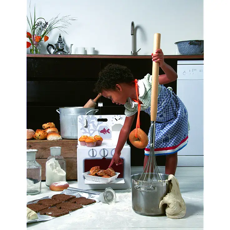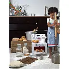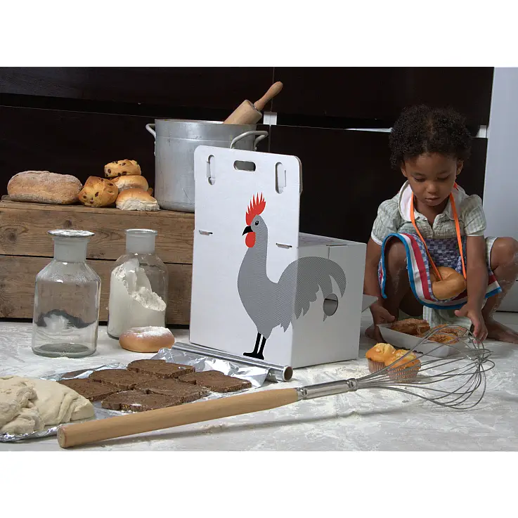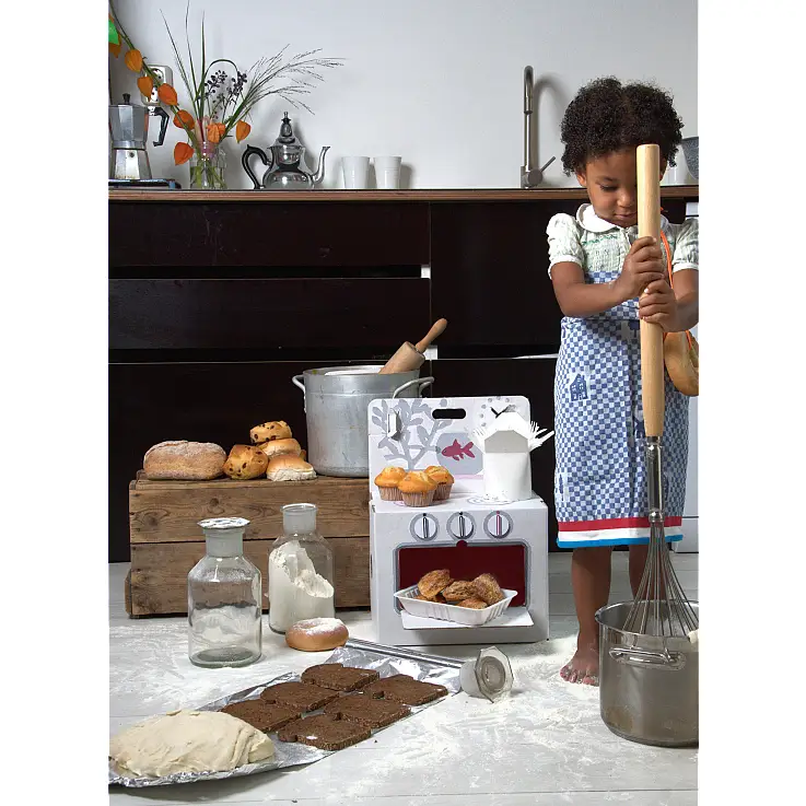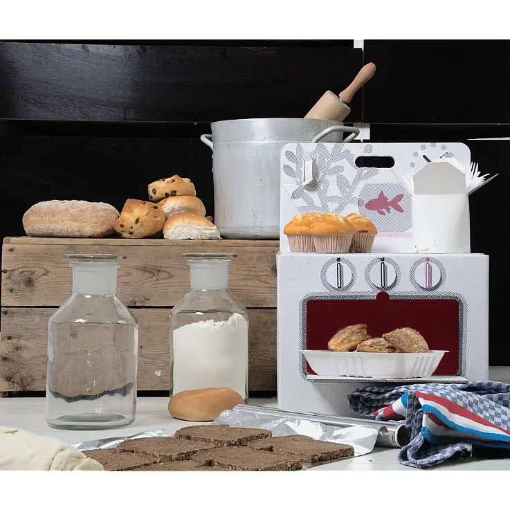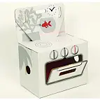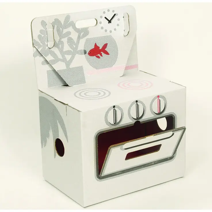 Pequeña (22 x 34 x 45 cm), ligera (1,5 kg) y fabricada en cartón reciclado, tiene un diseño muy cuidado. Incluye una puertecita en el horno que se puede abrir y cerrar para meter y sacar lo que quieras calentar (de mentira, claro).