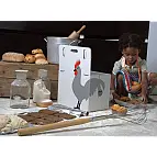 En la parte delantera incluye dibujos de una pecera con un pez, una planta y un reloj, encima de la lumbre y el horno. Y en la parte trasera, un gallo gris y rojo.