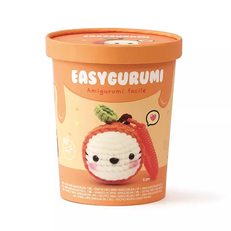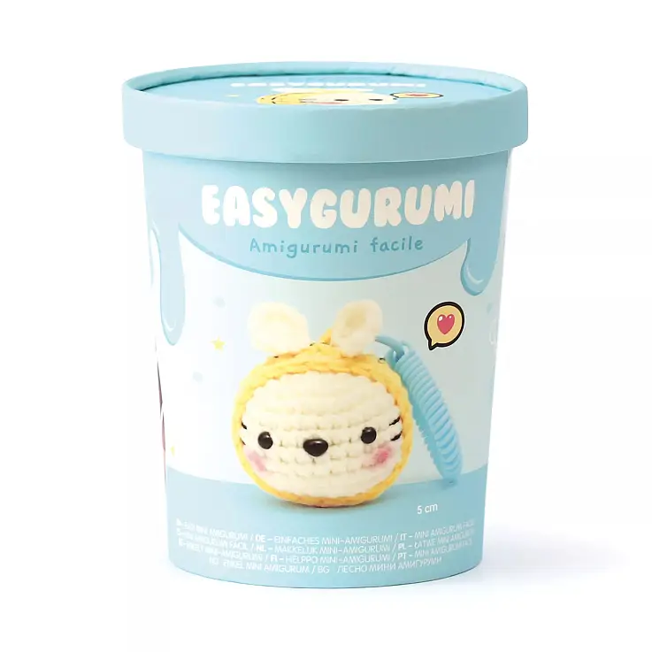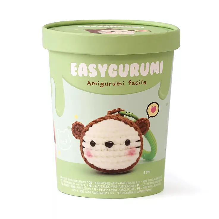 - El kit de amigurumi fácil para crear tu propio llavero va embalado en un bote de cartón ilustrado.