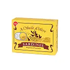 - Lata de sardinas que contiene seis tenedores de aperitivo con forma de raspa de sardina.