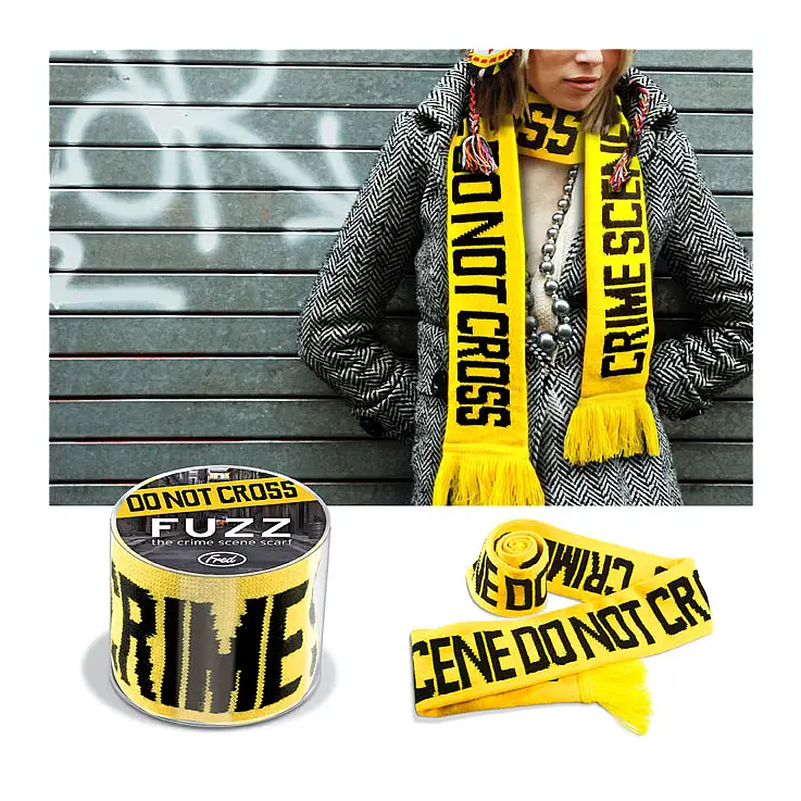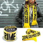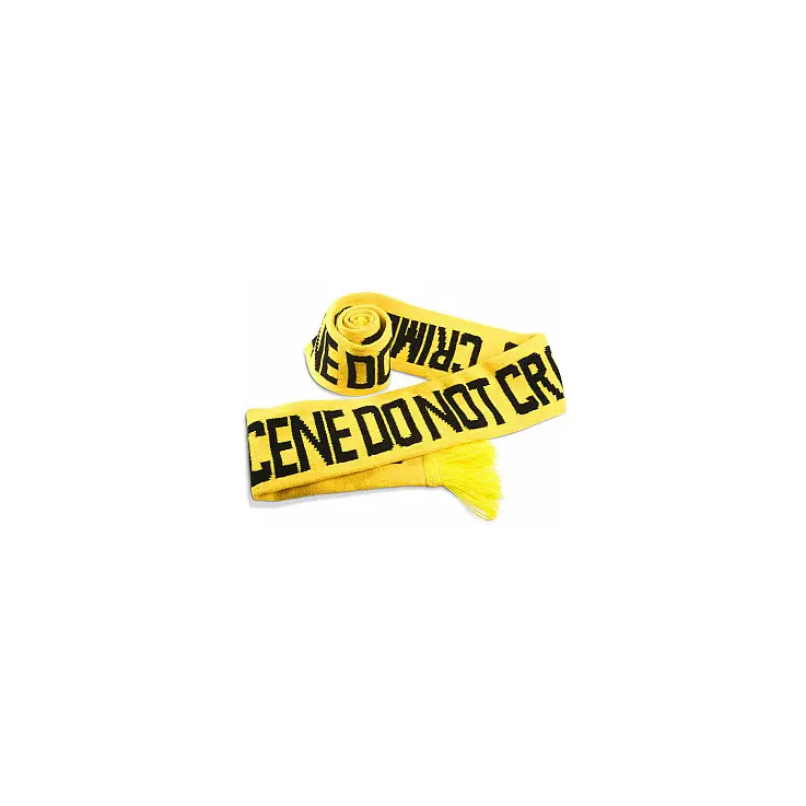Precinta tu garganta con esta bufanda calentita de color amarillo con legras negras. Imita el diseño de las cintas policiales que sellan la escena del crimen.