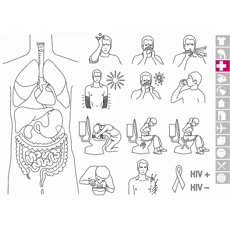 En su interior encontrarás 2000 símbolos, ilustraciones e iconos repartidos en 12 categorías diferentes: higiene, hoteles, primeros auxilios, mapas, comida... Podrás pedir un pañal para tu hijo en un hotel de Bangkok, comer comida sin sal en Shangai o pedir asistencia médica si has sufrido un accidente en cualquier parte del mundo.
